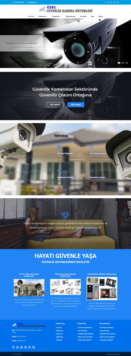 Özellikle güvenlik sistemleri şirketleri için hazırlanmış olan, web sitesi paketi tasarımını istedğiniz sektörde rahatlıkla kullanabilirsiniz. Site içeriğiniz , özenli bir şekilde , şirket profilinize , ürün ve hizmetlerinize göre düzenlenerek yayına verilecektir.